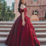 Este vestido corte princesa en un profundo tono vino combina la fuerza del color con la delicadeza del diseño. La falda amplia está formada por suaves escarolas en gasa, que crean movimiento y textura con cada paso, como si flotaras en tu gran noche.